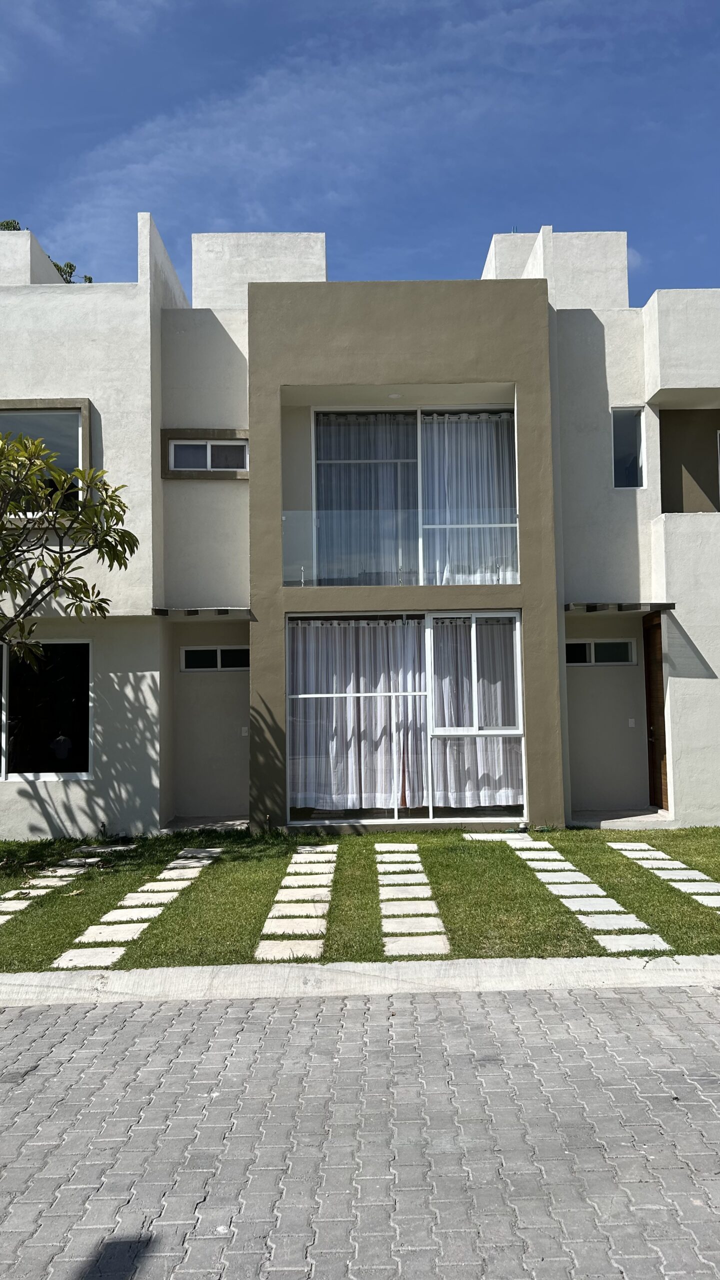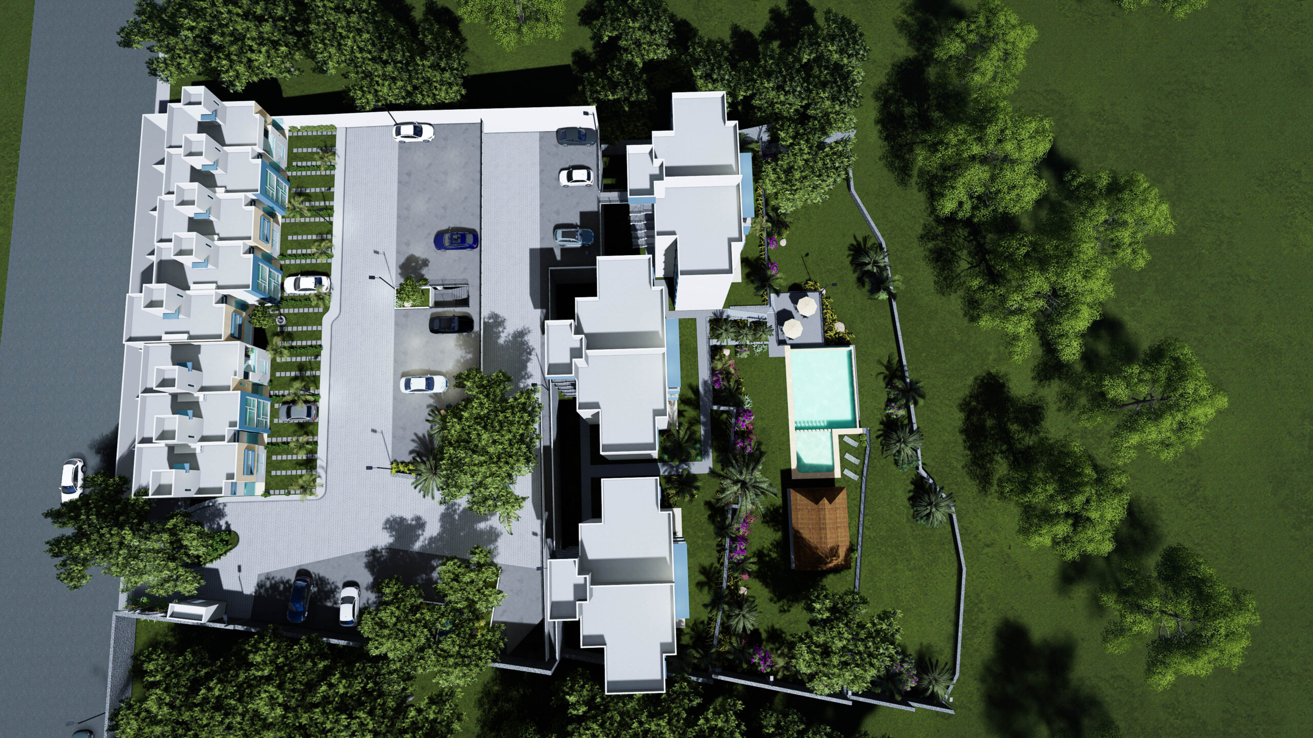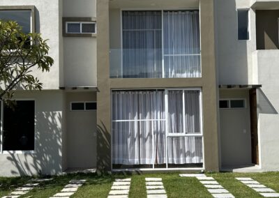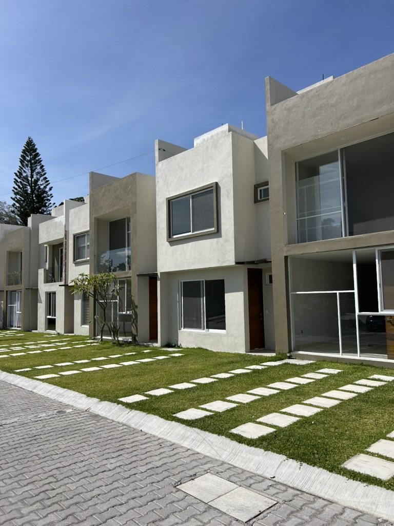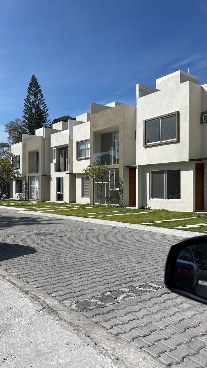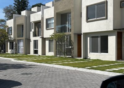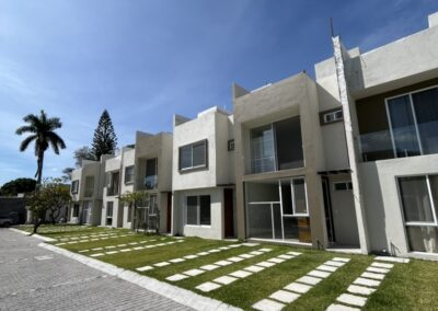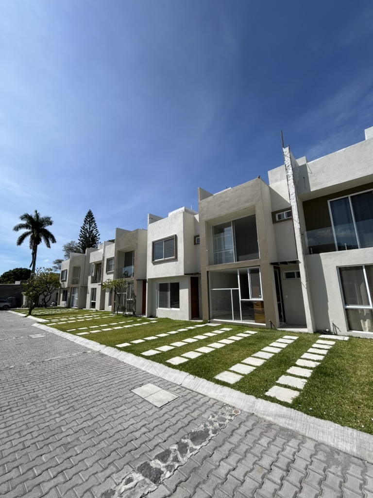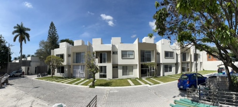Condominio residencial mixto de casas y departamentos, equipado con portón automático, estacionamiento privado y un área común con un amplio jardín, alberca y palapa para el uso de los residentes.